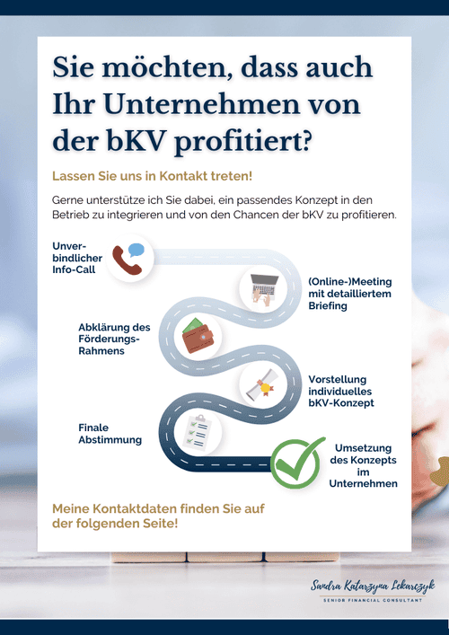 Gerne unterstütze ich sowohl Arbeitgeber*innen, als auch Arbeitnehmer*innen dabei, ein passendes Konzept in den Betrieb zu integrieren und von den Chancen der bKV zu profitieren.