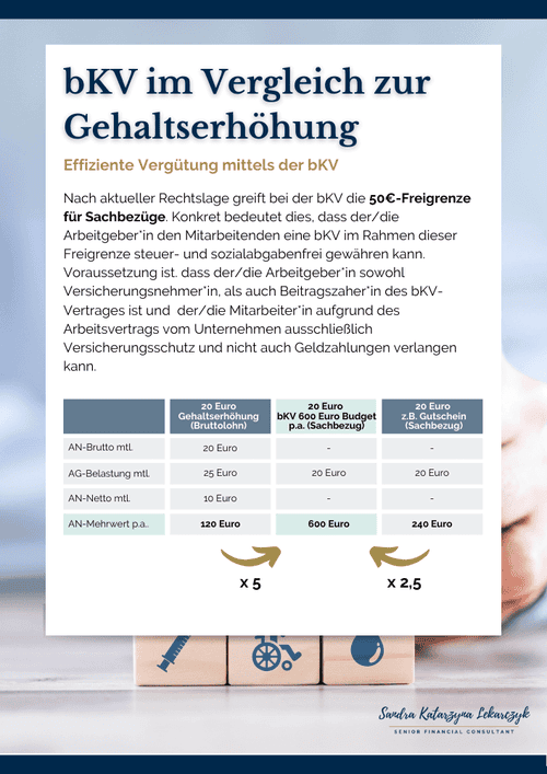 Die steuerlichen und sozialversicherungsfreien Gestaltungsmöglichkeiten machen die bKV zu einer attraktiven und kostengünstigen Alternative zur klassischen Gehaltserhöhung.