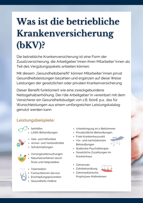 Bei der bKV handelt es sich um einen „Gesundheitsbenefit“, mit dem Mitarbeiter*innen privat Gesundheitsleistungen im Rahmen des Leistungskatalogs bezahlen können. Dieser Benefit funktioniert wie eine zweckgebundene Nettogehaltserhöhung. Im Kern geht es darum, Mitarbeiter*innen gesund und stabil zu halten.