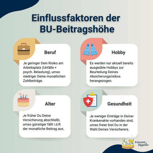 Wie Du den drei Wahrheiten (grüne Banner) entnehmen konntest, spielen insgesamt vier Kriterien beim Abschluss einer Berufsunfähigkeitsversicherung eine Rolle: der Gesundheitszustand, das Einstiegsalter, der Beruf und die Hobbies.